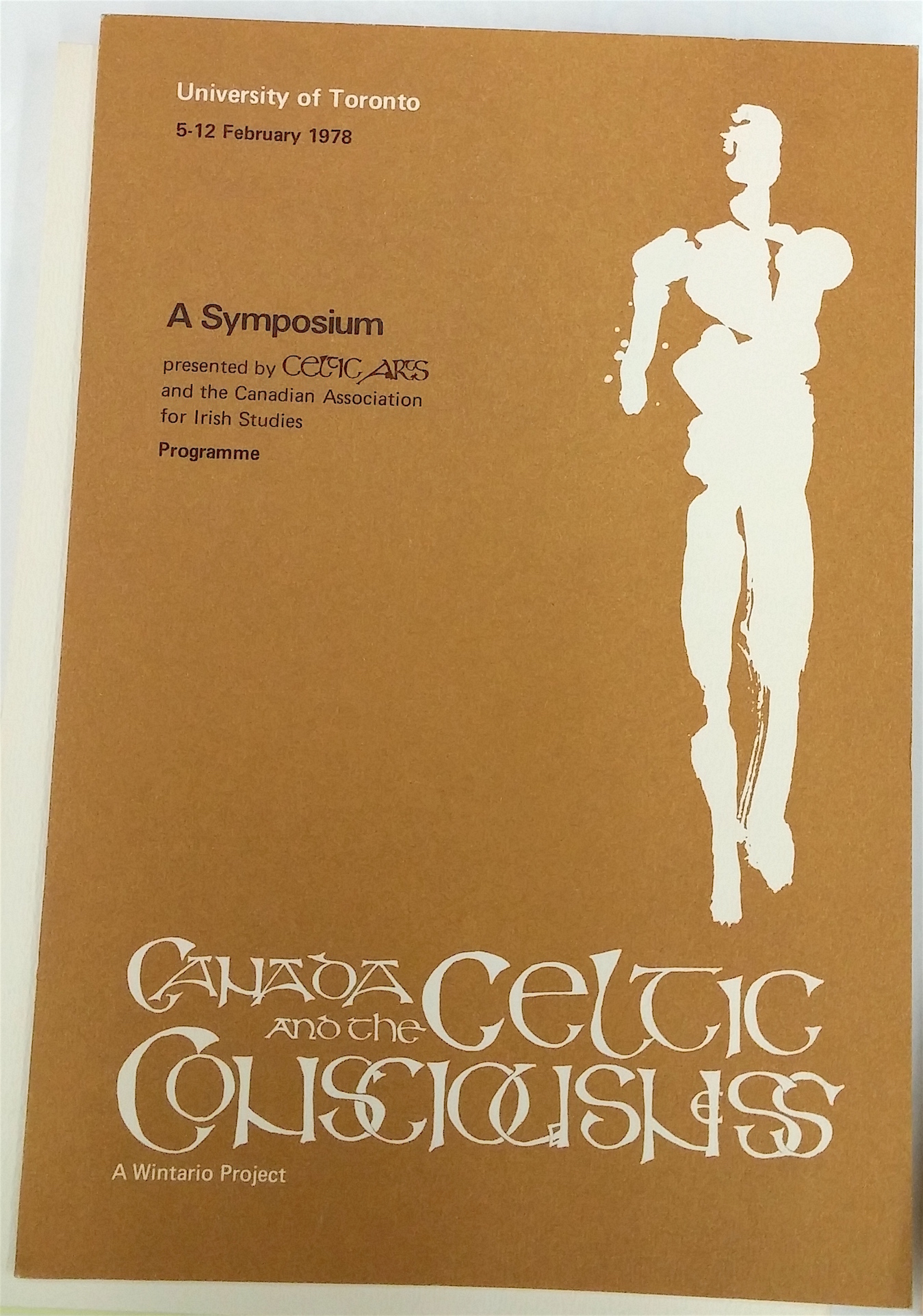 Canada and the Celtic Consciousness: A Symposium [Programme]. (February 5-12, 1978). University of Toronto. Celtic Arts and the Canadian Association for Irish Studies. File StS 6.3, Special Collections, Irish Arts. John M. Kelly Library, University of St. Michaels College, University of Toronto. This is the cover of the pamphlet for the symposium The Celtic Consciousness, organized by the UofT Celtic Arts Society. Taking place between February 5-12, 1978, it inspired several other related events, speaker talks and later a book containing the 55 essays discussed at the conference. O’Driscoll was the convener and Chairman of the committee responsible for planning the symposium.