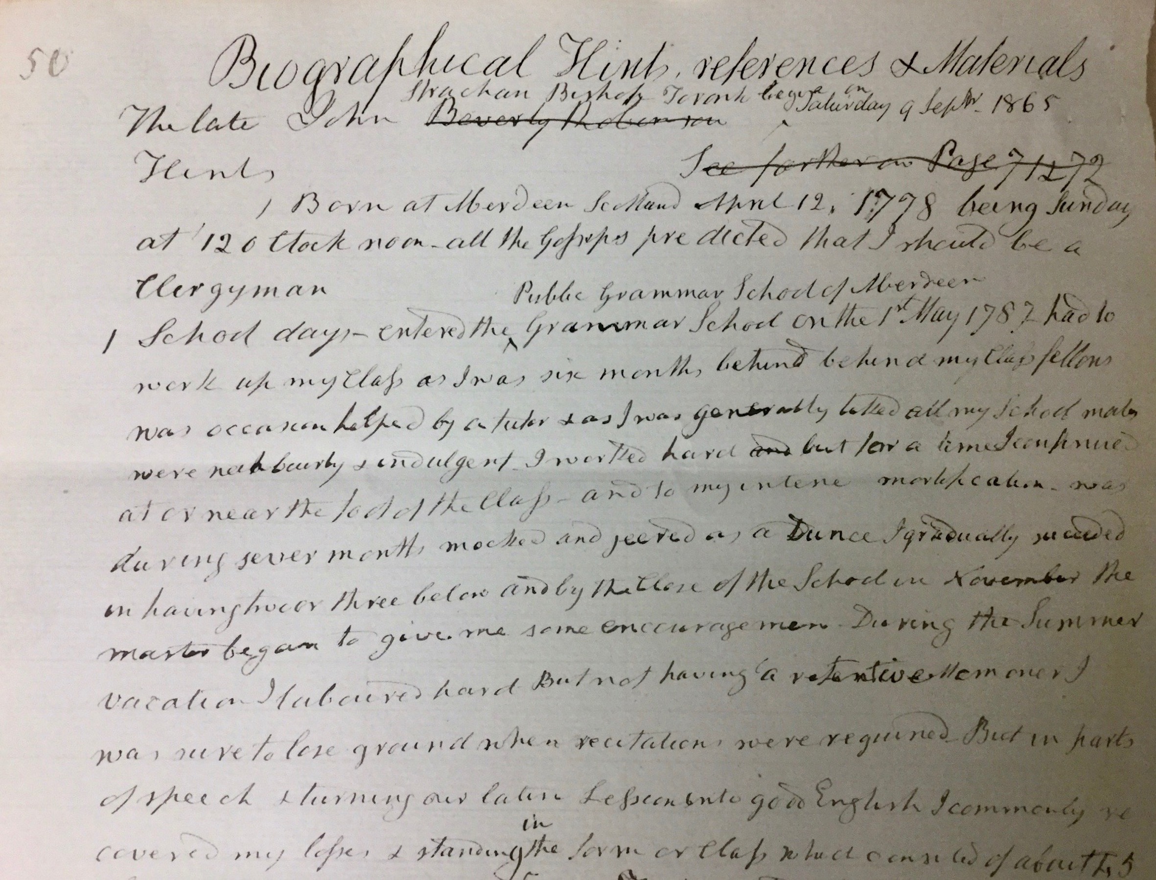 A written account of John Strachan’s early life and journey to Canada in 1799, dated 1865 (page 1 of 3). Courtesy of Trinity College Archives.
